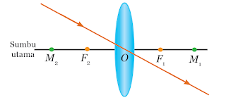 - Suatu sinar datang melalui pusat optik lensa (O) akan diteruskan tanpa dibiaskan.